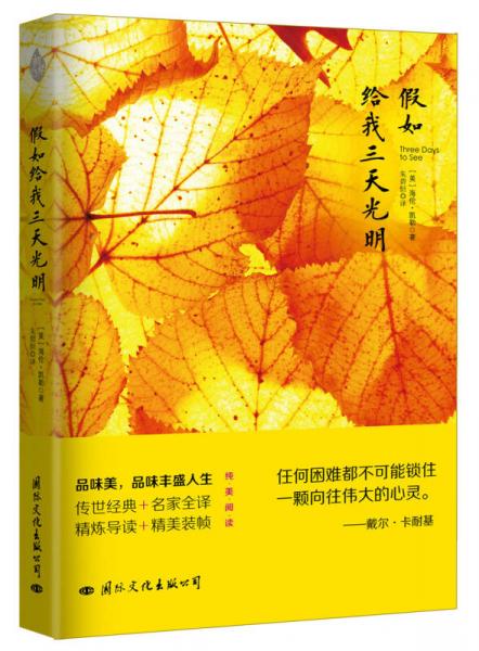 在《假如给我三天光明》这篇著名散文里,海伦赞美了壮丽的大自然,称颂了人类的历史与文明,抒发了对友情与日常生活的眷恋,劝告读者要善待眼睛、珍惜视听,把每一天都当做生命中的最后一天,“带着优雅端庄、精力充沛、知足感恩的心态来过好每一天”。