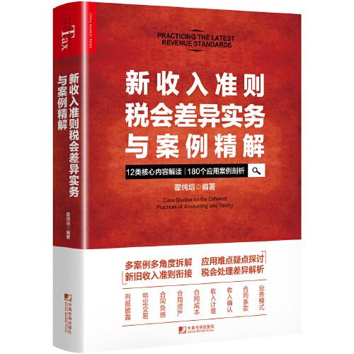 ★★180个新收入准则应用案例精解★★ 多案例多角度拆解 应用难点疑点探讨 新旧收入准则衔接 税会处理差异解析 ■关于取得商品控制权 ■关于识别与客户订立的合同 ■关于合同变更 ■关于识别合同中的单项履约义务 ■关于确定交易价格 ■关于将交易价格分摊至各单项履约义务 ■关于时段履约与时点履约 ■关于合同履约成本与合同取得成本 ■关于合同资产与合同负债 ■关于主要责任人与代理人 ■关于特定交易 ■关于新旧收入准则衔接