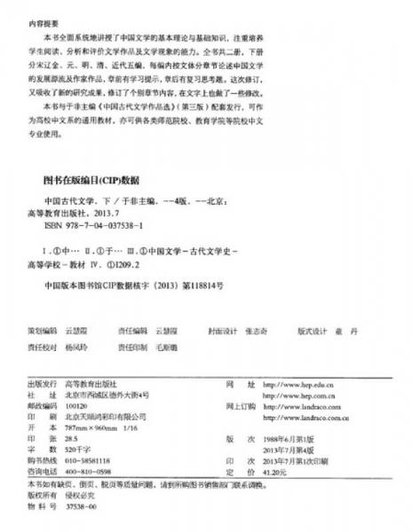 《中国古代文学(第4版)(下册)》与于非主编《中国古代文学作品选》(第三版)配套发行,可作为高校中文系的通用教材,亦可供各类师范院校、教育学院等院校中文专业使用。