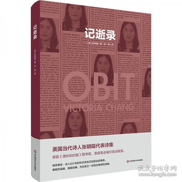 记逝录是美国当代诗人张明皚(victoria chang)的代表作。本书出版于2020年,曾获洛杉矶时报图书奖、美国笔会福尔克诗歌奖,入围美国书评人协会奖短名单和美国图书奖长名单。母亲离世,诗人拒绝写挽歌,而是在悲痛又焦灼的两个星期里为她在这个世界上所失去的写起了讣告。悲伤在讣告中升华。在这本获得诸多奖项和提名的诗集里,诗人写道:“人死后,记忆醒来,迈开了双腿。” 诗人以报纸讣告的形式命名已经逝去的事物(如礼节、语言、未来、母亲的蓝裙子)以及对生者的影响。这本诗集勇敢而温暖,直面悲痛,为生者立了一份饱含情感的遗嘱。