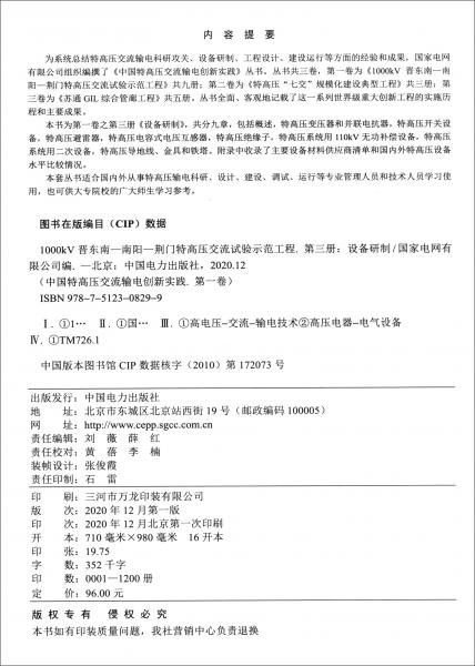 本书为首卷之第三册《设备研制》,共分九章,包括概述,特高压变压器和并联电抗器,特高压开关设备,特高压避雷器,特高压电容式电压互感器,特高压绝缘子,特高压系统用110kV无功补偿设备,特高压系统用二次设备,特高压导地线、金具和铁塔。附录中收录了主要设备材料供应商清单和国内外特高压设备水平比较情况。