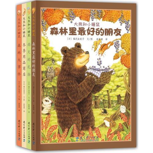 《大熊和小睡鼠》包括《森林里最好的朋友》《雨天的礼物》《森林大事件》《冬季用品商店》四本。作者以细腻的笔触、生动的语言为孩子们描绘了一个绚烂多彩的四季森林,讲述了生活在那里的大大的大熊和小小的睡鼠之间发生的感人故事…… 《森林里最好的朋友》——大熊喜欢小小的东西,小睡鼠偏爱大大的东西。第一次见面他们就成了好朋友。一天,蛋糕店店长送给他们两棵花苗,大熊选了一棵小的,小睡鼠选了一棵大的。秋天到了,大熊的小花园里硕果累累,小睡鼠的大花园里却枝叶枯萎…… 《雨天的礼物》——森林里下起了暴风雨。大熊被雷声吓得躲在被子里发抖,不敢和小睡鼠一起去看紫阳花。小睡鼠独自跑进暴雨中,到七色谷为大熊采紫阳花。后来,山洪爆发了,大熊惦记着小睡鼠的安危,不顾一切地跑向七色谷……一个关于勇敢和友谊的故事,让人从中感受到友情的力量。 《森林大事件》——春天来了,融化的雪水冲坏了悬崖,小蜜蜂的房子—— 一棵枯树就要掉下悬崖了。小睡鼠心急如焚地来找大熊帮忙,可是,仍在冬眠的大熊却无论如何也醒不过来……小蜜蜂们的命运会如何呢? 《冬季用品商店》—— 一天,森林里的小动物们都收到了一封信:冬季用品商店开业了。小动物们急急忙忙跑到森林里采橡子,好去换过冬用品。大熊和小睡鼠也怀揣着各自的小秘密,紧张地到处找橡子。为了凑足最后一棵橡子,他们费尽了周折,甚至互不相让……细腻而美丽的画面,演译了一个在寒冷的冬天可以温暖心灵的感人故事。